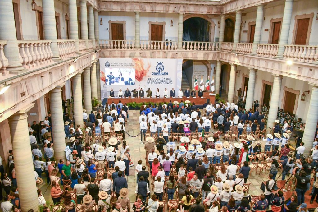 Desde la Alhóndiga de Granaditas, recinto de la Patria, el alcalde de Guanajuato Capital, Alejandro Navarro, llamó a seguir trabajando por el estado y por México “con el mismo nivel de pasión y determinación que nos hizo nacer como nación”.